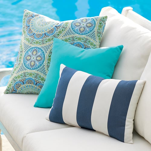 Color-popping with ultra-comfortable, Neptune-hued deep-seating cushions, the casual, squared Essex Outdoor Seating Collection, an all-weather wicker seating group in clean white makes a classic coastal color combo seem new again. Play up those contrasts to keep the look fresh: with the squared lines, we liked a rounded Kingston textured-metal table; you may try something else. The linear look of the vibrant striped Tortola Outdoor Rug and geometrically patterned Penelope Outdoor Pillows and denim-colored outdoor pillows add nicely updated graphic energy.