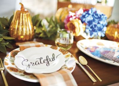 - Harvest Tableware: our word plates say Gather, Family, Thankful, and Grateful