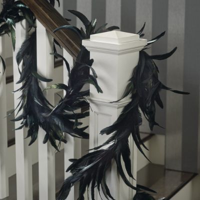 4. EMBELLISH WITH FEATHERS. Adding a strand of chic feather garland draped around furniture in your home will certainly add an elegant touch to your spooky décor.